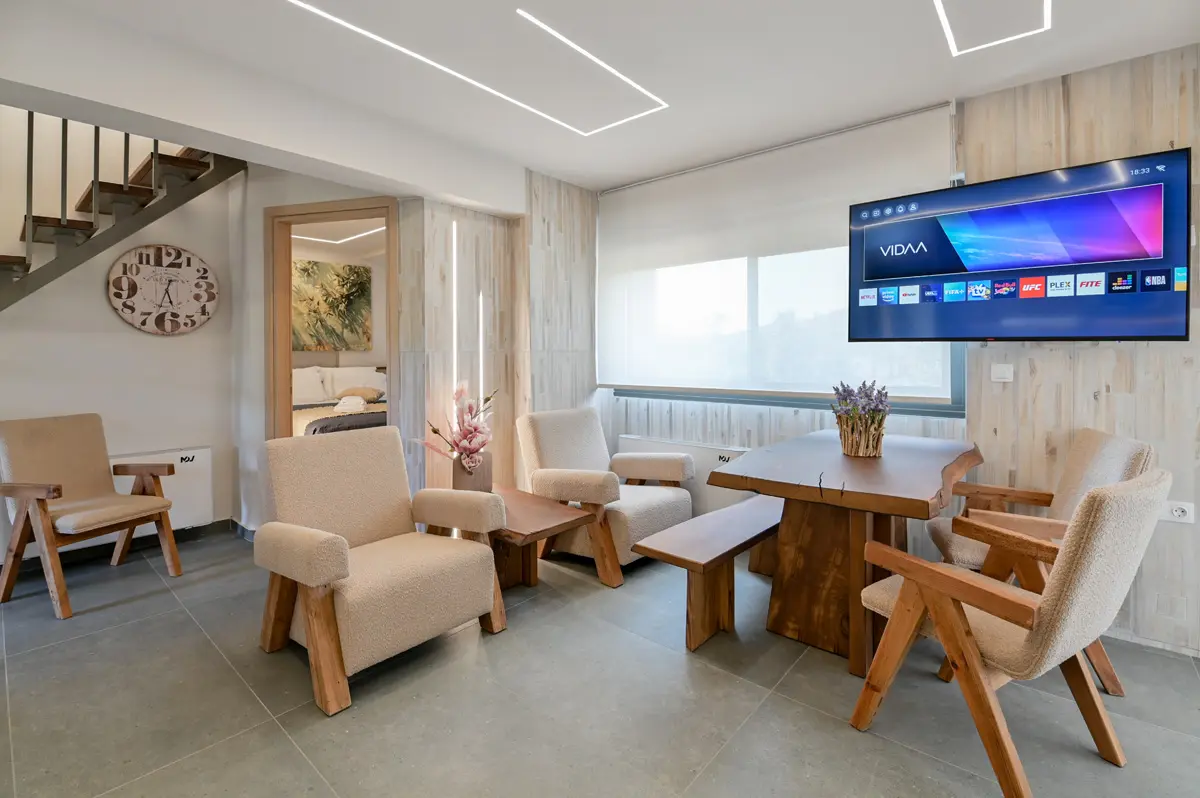 Η σουίτα απευθύνεται σε μεγαλύτερες παρέες ή οικογένειες που θέλουν να απολαύσουν τις διακοπές τους με άνεση. Τρία υπνοδωμάτια και δύο μπάνια συνθέτουν έναν πλήρη χώρο διαμονής.